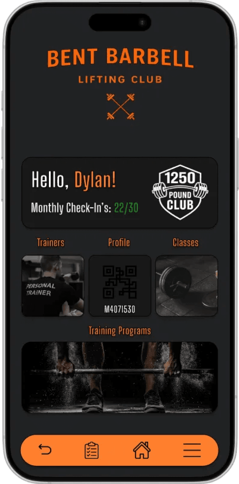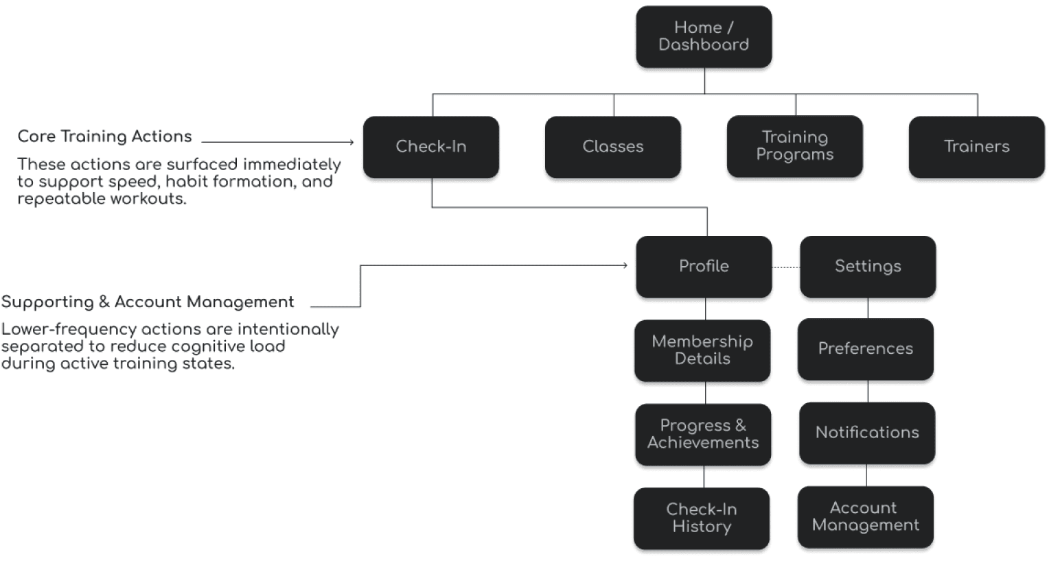 The structure prioritizes speed and repeat behavior by keeping core actions one tap away, while secondary tasks are accessible without disrupting training flow.