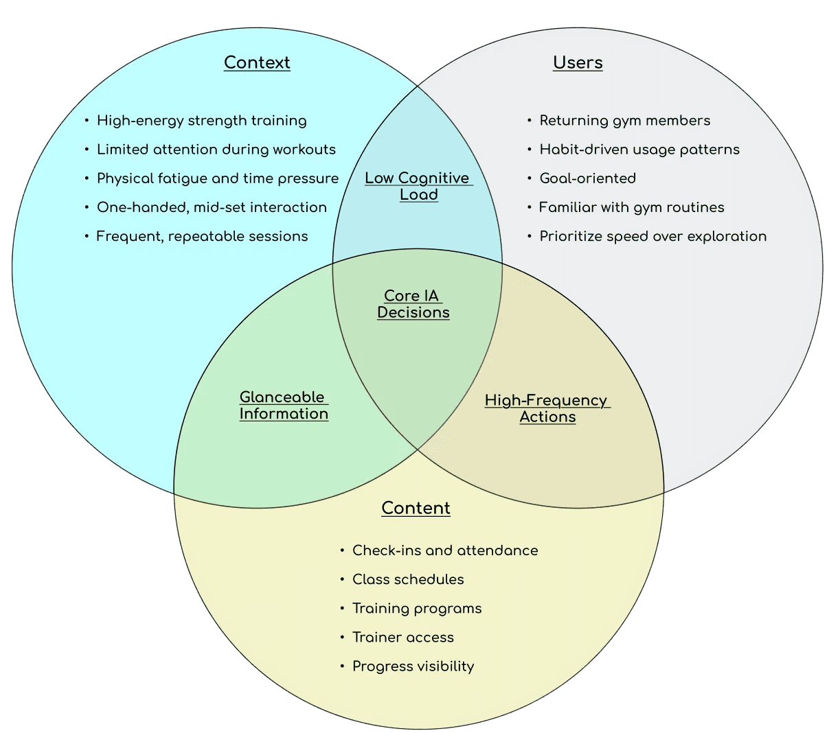 This framework guided key design decisions like prioritizing glanceable information, reducing steps between actions, and supporting one-handed use during workouts.
